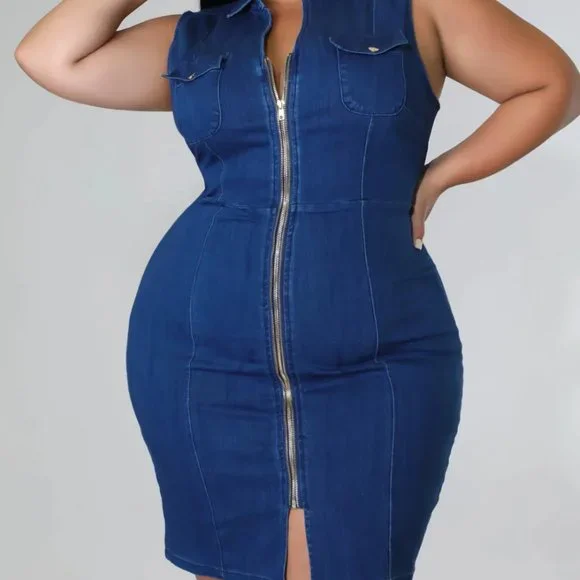 Plus Size Women Casual Elegant Denim Sleeveless Bodycon Zipper Dress
